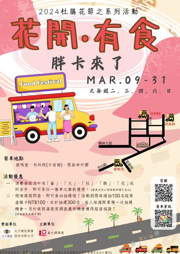 優惠小確幸: 付款時出示中文姓名中任一有「臺」、「大」、「杜」、「鵑」、「花」或同音字證件,可享有該餐車專屬優惠!