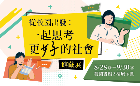 總圖書館2樓展示區,現正展出「從校園出發:一起思考更好的社會」館藏展,展期自2025年8月28日至9月30日止。