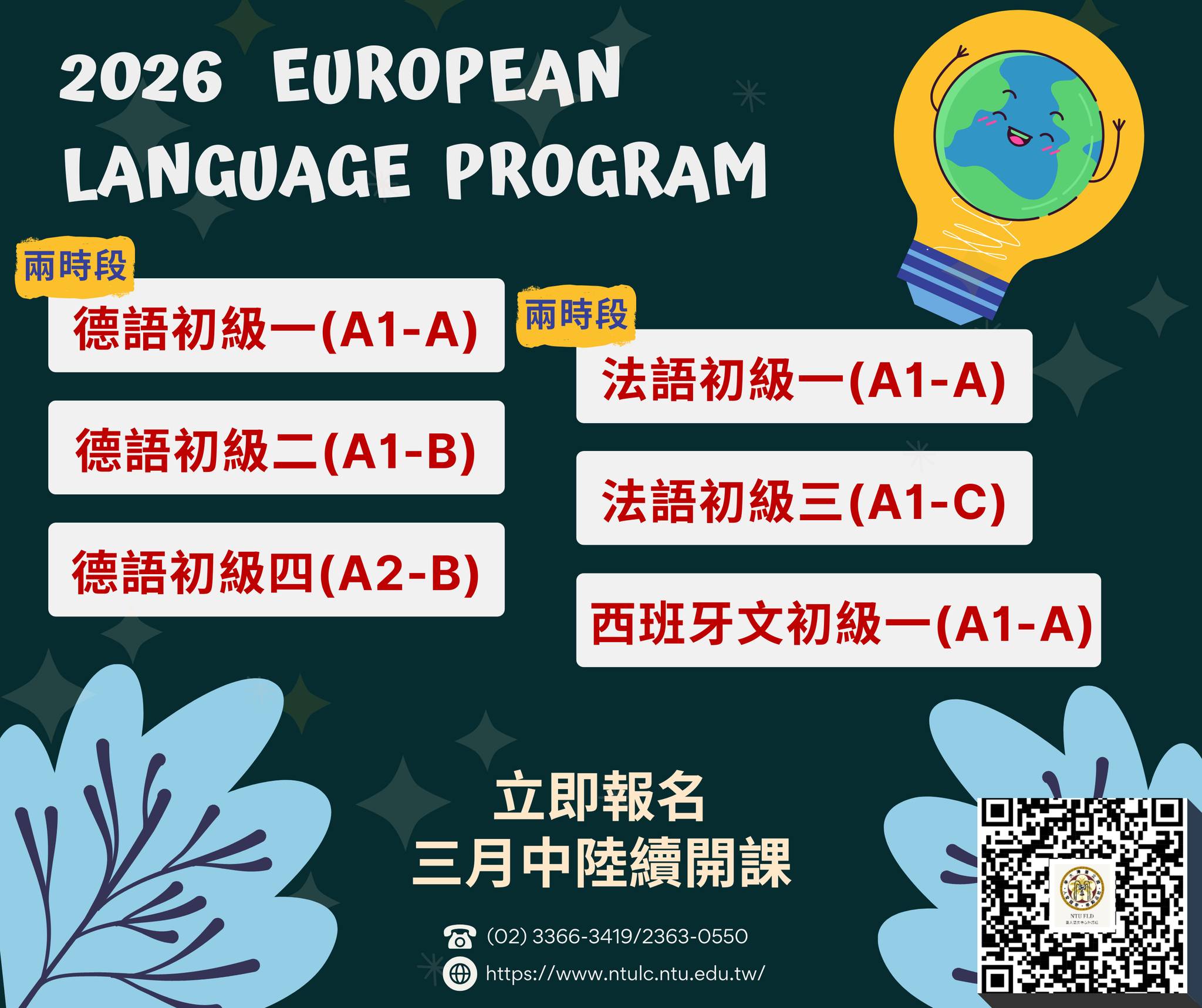 德文、法文與西班牙文同步登場,透過十週循序設計與互動式教學,引導學員從零開始穩定累積實力,在輕鬆節奏中培養實際運用信心。除了英語,不妨為自己開啟全新的語言視野,讓學習多一點文化深度,也多一份國際競爭力。無論你是學生、上班族、退休族、家管或樂齡學員,都能依自身節奏找到合適起點。部分初級課程提供多時段選擇,彈性安排不怕撞課。現在就點擊連結或掃描 QR Code 了解課程內容,讓語文中心陪你踏出第一步,把新的語言慢慢走進生活。